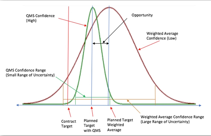 - The black double-arrow between the two planned targets is the opportunity gap, representing the value reclaimed by using QMS predictions